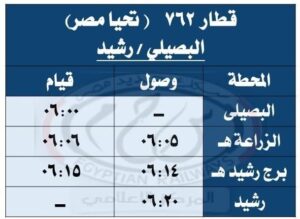 حيث تقرر تعديل ميعاد قيام قطار 762 (تحيا مصر) البصيلى / رشيد ليقوم الساعة 06:00 صباحًا بدلاً من الساعة 06:35 صباحًا