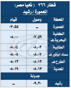وتعديل ميعاد قيام قطار 766 (تحيا مصر) المعمورة / رشيد ليقوم الساعة 07:55 صباحًا بدلاً من الساعة 07:50 صباحًا.