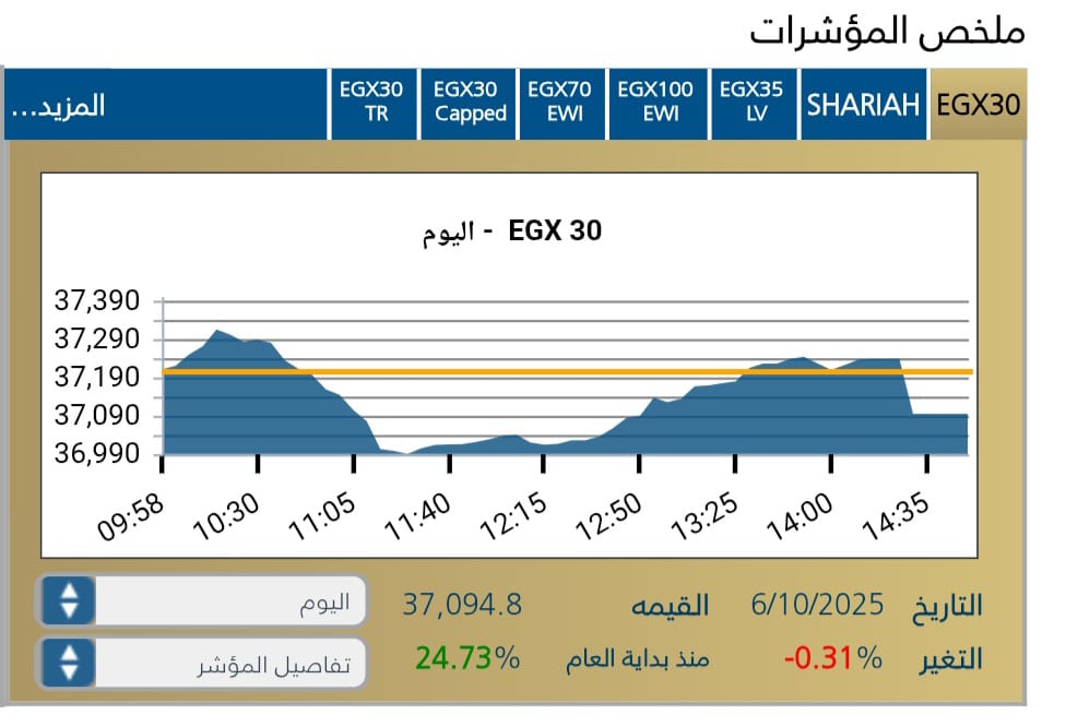 حيث سجل المؤشر الرئيسى للبورصه المصريه EGX30 تراجعا بنسبة0,31-% ليغلق عند مستوى 37,094,8 نقطه ، وسط تدولات قيمتها5,116 مليار جنيه.