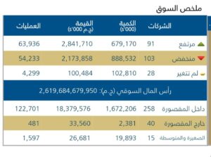 بلغ عدد العمليات المنفذه 122,468 المقيده نحو 2,619,684,679,950 تريليون جنيه بدعم من المؤسسات، مع استمرار مخاوف المستثمرين وتراجع السيوله، ما يعكس حالة الحذر والتردد فى السوق .