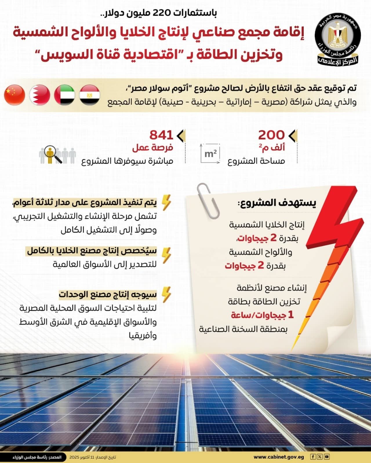 يمثل مشروع “أتوم سولار مصر” نقلة نوعية نحو توطين صناعة الطاقة الشمسية في مصر، حيث يفتح آفاقًا واسعة لبناء سلاسل إمداد متكاملة لقطاع الطاقة الجديدة والمتجددة، كما أنه يعزز من مكانة مصر كمنصة لتوطين الصناعات الخضراء، فضلًا عن مساهمته في خلق فرص مستقبلية للتوسع في مشروعات تخزين الطاقة، التي تعد أحد العناصر الجوهرية لتعزيز كفاءة استخدام مصادر الطاقة المتجددة وضمان استدامتها، بما يساهم في تحقيق أهداف التنمية المستدامة ورؤية مصر 2030.