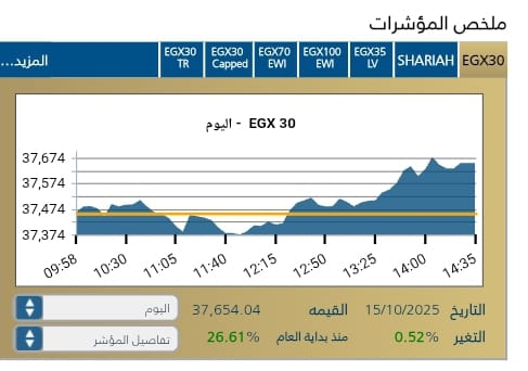 وصعد المؤشر الرئيسي EGX30 بنسبة 0,52% ليغلق عند مستوى 37,654,04نقطة، مدفوعًا بارتفاع أسهم القياديات وسط تدولات قيمتها 4,861مليار جنيه .