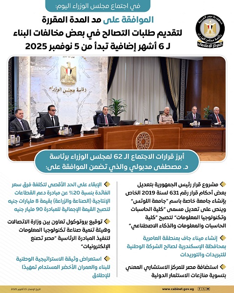 الموافقة على مد المدة المقررة لتقديم طلبات التصالح في بعض مخالفات البناء لـ 6 أشهر إضافية تبدأ من 5 نوفمبر 2025