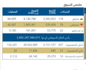 بلغ عدد العمليات المنفذه 131,942 المقيده نحو 2,692,287,946,675 تريليون جنيه بدعم من المؤسسات المحليه ،مع ترقب المستثمرين استمرار هذا الزخم خلال الجلسات القادمه .