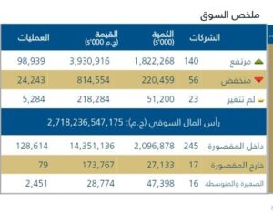 بلغ عدد العمليات المنفذه 128,466 المقيده نحو 2,718,236,547,175 تريليون جنيه بدعم من المؤسسات المحليه ،مع ترقب المستثمرين استمرار هذا الزخم خلال الجلسات القادمه .