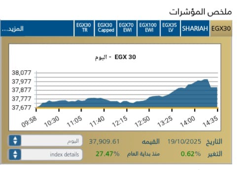 سجل المؤشر الرئيسى للبورصه المصريه EGX30 ارتفاعا بنسبة 0,62% ليغلق عند مستوى 37,909,61نقطه ، وسط تدولات قيمتها 4,963 مليار جنيه .