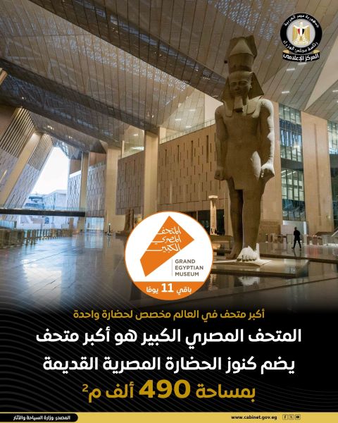 <h4><span style="color: #ff0000;"><strong>خاص: سوق المال</strong></span></h4> <h4>المتحف المصري الكبير، بمساحة 490 ألف م٢، صرح حضاري يعكس عظمة الحضارة المصرية القديمة ويتيح للزوار استكشاف تاريخها الغني <span style="color: #ff0000;"><strong>#المتحف_المصري_الكبير</strong></span> <span style="color: #ff0000;"><strong>#وزارة_السياحة_والآثار </strong></span> <span style="color: #ff0000;"><strong>#المركز_الإعلامي_لمجلس_الوزراء </strong></span> <span style="color: #ff0000;"><strong>#رئاسة_مجلس_الوزراء</strong></span></h4>