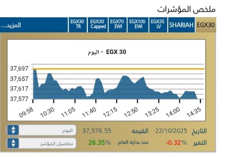 اختتمت البورصه المصريه تعاملات جلسة اليوم الاربعاء 22 اكتوبر على تراجع جماعى للمؤشرات ، وسط ضغوط بيعيه من المستثمرين ، وغياب واضح للسيوله القويه ، مما افقد السوق زخمه . حيث سجل المؤشر الرئيسى للبورصه المصريه EGX30 تراجعا بنسبة0,32-% ليغلق عند مستوى37,576,55 نقطه ، وسط تدولات قيمتها5,392مليار جنيه. ومن خلال ذالك نعرض تفاصيل جلسة اليوم.. انهت البورصه المصريه تعاملات اليوم مع تراجع واضح فى نهاية الجلسه. اذا ارتفعت اسهم 90شركه فقط وهبطت اسهم 110 شركه وبقاء اسهم 18 شركه مستقره عل مستويات أسعارها بدون تغير . بلغ عدد العمليات المنفذه 146,447 المقيده نحو 2,726,134,764,208 تريليون جنيه بدعم من المؤسسات، مع استمرار مخاوف المستثمرين وتراجع السيوله، ما يعكس حالة الحذر والتردد فى السوق .