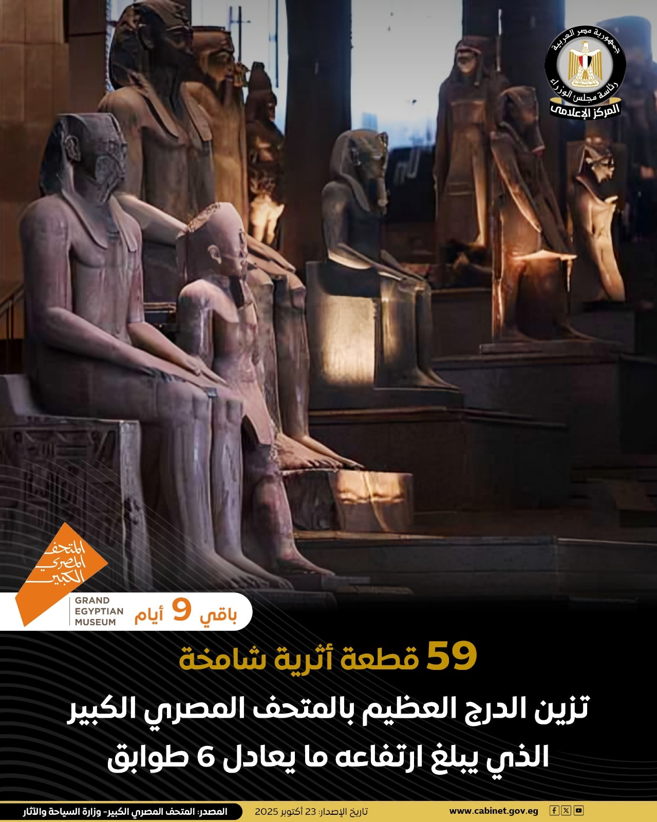 على الدرج العظيم بالمتحف المصري الكبير، تتألق 59 قطعة أثرية تمثل جانباً من عظمة الحضارة المصرية التي أبهرت الإنسانية، يُعد الدرج العظيم أحد أبرز معالم المتحف بمساحته البالغة 6 آلاف م2 وارتفاعه الذي يعادل 6طوابق. رحلة بصرية تأخذ الزائر من الحاضر إلى عمق الماضي، بين آثارٍ تنطق بعظمة مصر عبر العصور. #المتحف_المصري_الكبير #وزارة_السياحة_والآثار #المركز_الإعلامي_لمجلس_الوزراء #رئاسة_مجلس_الوزراء