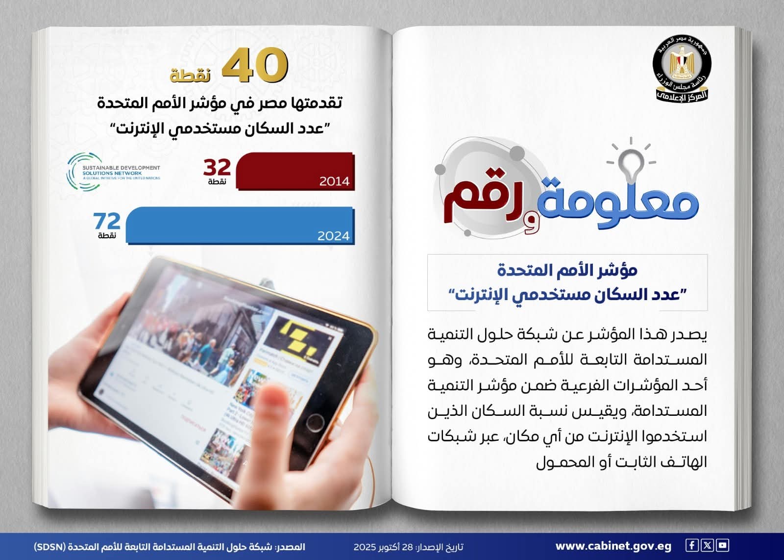 شهد قطاع الاتصالات في مصر خلال العقد الماضي تطورًا كبيرًا نتيجة للاستثمارات التي تم ضخها في البنية التحتية الرقمية، والتوسع في نطاق خدمات الاتصالات لتشمل ملايين المواطنين، حيث وصل عدد مشتركي الإنترنت عن طريق الهاتف المحمول إلى 90.64 مليون مشترك، فيما وصل عدد مشتركي إنترنت النطاق العريض الثابت إلى 12.18 مليون مشترك في يوليو 2025، مما انعكس على تحسن نقاط مصر في مؤشر الأمم المتحدة “عدد السكان مستخدمي الإنترنت” بإجمالي 40 نقطة خلال 10 سنوات.