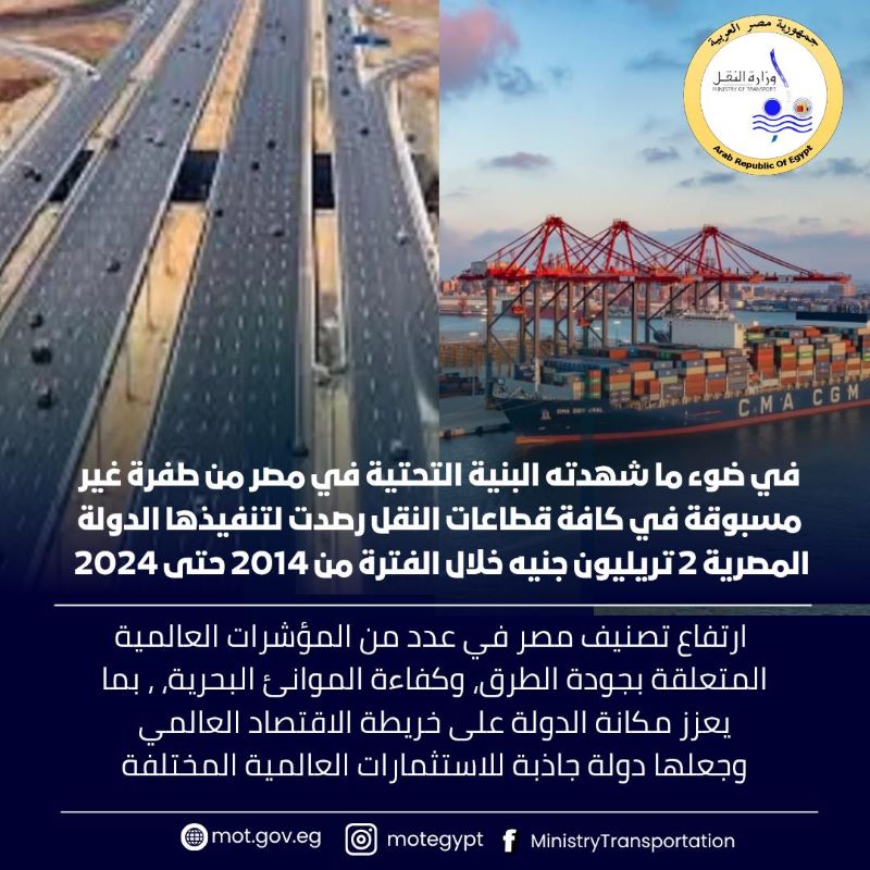 وحيث كان أحد ابرز النتائج الإيجابية لما قامت به الدولة المصرية من تنفيذ بنية تحتية عملاقة في مجال النقل هو ارتفاع تصنيف مصر في عدد من المؤشرات العالمية المتعلقة بجودة الطرق، وكفاءة الموانئ البحرية، ، بما يعزز مكانة الدولة على خريطة الاقتصاد العالمي وجعلها دولة جاذبة للاستثمارات العالمية المختلفة ،