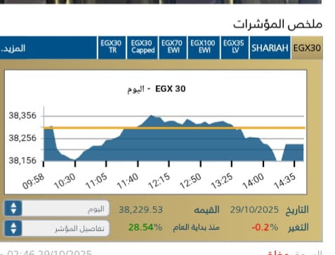 كتبت : ندى خليل اختتمت البورصه المصريه تعاملات جلسة اليوم الاربعاء 29 اكتوبر على تراجع جماعى للمؤشرات ، وسط ضغوط بيعيه من المستثمرين ، وغياب واضح للسيوله القويه ، مما افقد السوق زخمه . حيث سجل المؤشر الرئيسى للبورصه المصريه EGX30 تراجعا بنسبة0,2-% ليغلق عند مستوى38,229,53 نقطه ، وسط تدولات قيمتها 4,682مليار جنيه. ومن خلال ذالك نعرض تفاصيل جلسة اليوم.. انهت البورصه المصريه تعاملات اليوم مع تراجع واضح فى نهاية الجلسه. اذا ارتفعت اسهم 84شركه فقط وهبطت اسهم 107 شركه وبقاء اسهم 29شركه مستقره عل مستويات أسعارها بدون تغير . بلغ عدد العمليات المنفذه 116,616 المقيده نحو 2,766,382,102,061 تريليون جنيه بدعم من المؤسسات، مع استمرار مخاوف المستثمرين وتراجع السيوله، ما يعكس حالة الحذر والتردد فى السوق .