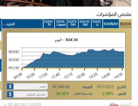 وصعد المؤشر الرئيسي EGX30 بنسبة 2,09% ليغلق عند مستوى 39,949,66نقطة، مدفوعًا بارتفاع أسهم القياديات وسط تدولات قيمتها 7,062مليار جنيه .