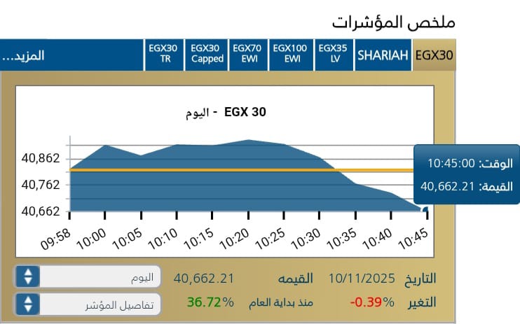 افتتحت البورصة المصرية جلسة تداول اليوم الاثنين 10 نوفمبر على تراجع جماعي للمؤشرات، متأثرة بحالة من الحذر سادت أوساط المستثمرين المحليين والعرب، وسط ضغوط بيعية وتذبذب في أداء الأسهم القيادية.