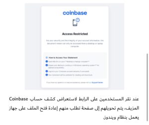 بدأ الهجوم عبر رسالة بريد إلكترونية زائفة تدعو المستخدمين إلى الضغط على رابط لمراجعة كشف حسابهم في منصة Coinbase. وادّعى المهاجمون أن الاطلاع على الكشف متاح فقط من خلال أجهزة ويندوز المكتبية أو المحمولة، في محاولة لخداع المستخدمين ودفعهم إلى تنزيل الملف وفتحه على تلك الأجهزة.