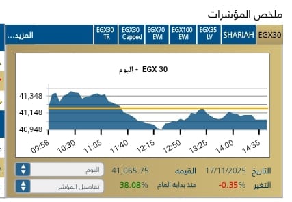 وتراجع المؤشر الرئيسي EGX30 بنسبة 0,35-% ليغلق عند مستوى 41,065,75نقطة، وسط تدولات قيمتها 7,053مليار جنيه .