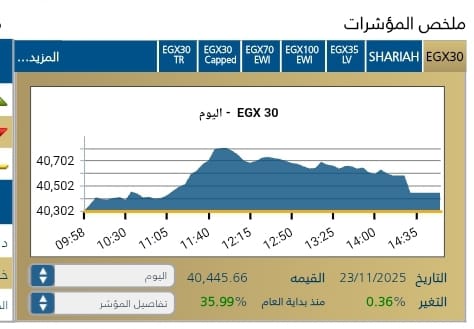 اختتمت البورصه المصريه جلسة تداول اليوم الاحد 23 نوفمبر بخطى ايجابيه ، حيث ارتفع المؤشر الرئيسى EGX30 نحو 40,445,66 نقطه ، مسجلا مكسبا نسبه 0,36 %، مدفوعا بارتفاع أسهم القياديات وسط تدولات قيمتها 4,703مليار جنيه .