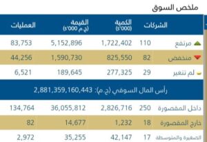 اذا ارتفعت اسهم 110 شركه وانخفضت اسهم 82شركة وبقاء اسهم 29شركه مستقره عل مستويات أسعارها بدون تغير .