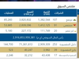 اذا ارتفعت اسهم 107شركه وانخفضت اسهم 91شركة وبقاء اسهم 20شركه مستقره عل مستويات أسعارها بدون تغير .