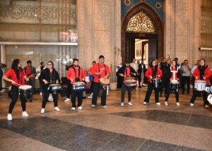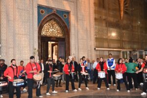 ووسط أجواء احتفالية قام وزير الشباب والرياضة بمصافحة الشباب المشاركين بالرحلة الذين عبروا عن سعادتهم البالغة بالمشاركة في البرنامج الذي يتيح تجربة فريدة لزيارة المعالم مصر التاريخية ، فيما قدمت الفرق الموسيقية الشبابية التابعة للوزارة عدد من المقطوعات الموسيقية التي اضفت المزيد من الحماسة والتفاعل من الشباب .