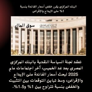 قررت لجنة السياسات النقدية بالبنك المركزى المصري خفض أسعار الفائدة بنسبة 1% على الإيداع والإقراض.