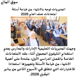 وجهت المديريات التعليمية الإدارات والمدارس بعدم استخدام التليفون المحمول أثناء عقد الامتحانات الخاصة بالفصل الدراسى الأول، مشددة على أهمية الانتهاء من طباعة الأسئلة وتجهيزها استعدادا للاختبارات التي تنطلق في الأسبوع الثانى من يناير المقبل 2026.