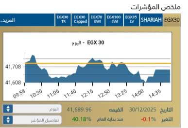 وتراجع المؤشر الرئيسي EGX30 بنسبة0,1-% ليغلق عند مستوى 41,689,96نقطة، وسط تدولات قيمتها 5,486مليار جنيه .