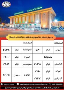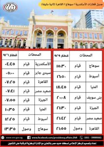 قررت الهيئة القومية لسكك حديدمصر، إعتبارا من يوم السبت الموافق ١٠ / ١ / ٢٠٢٦ امتداد مسير قطار ٩٢٦ ثانية فاخرة من الاسكندرية حتى سوهاج ليصل الساعة ١٣:٣٥ ، على ان يعود من سوهاج بقطار ٩٢٩ الساعة ١٥:٣٠ لينتهى بالقاهرة ، ويترتب على ذلك تعديل مسير قطارى ٨١و٧٢٣ (طبقا للجداول المرفقة ) .