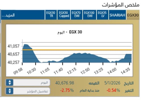حيث تراجع المؤشر الرئيسي EGX30 بنسبة 0,54-% ليغلق عند مستوى 40,676,98 نقطة، وسط تدولات قيمتها 6,162 مليار جنيه .