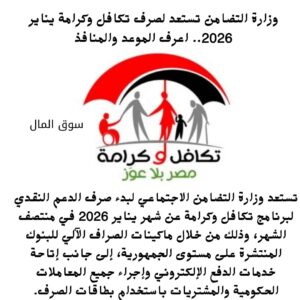 تستعد وزارة التضامن الاجتماعي لبدء صرف الدعم النقدي لبرنامج تكافل وكرامة عن شهر يناير 2026 في منتصف الشهر، وذلك من خلال ماكينات الصراف الآلي للبنوك المنتشرة على مستوى الجمهورية، إلى جانب إتاحة خدمات الدفع الإلكتروني وإجراء جميع المعاملات الحكومية والمشتريات باستخدام بطاقات الصرف.
