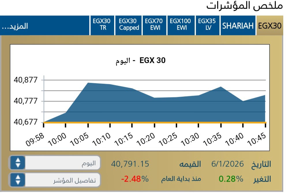 وسجل المؤشر الرئيسي EGX30 ارتفاعًا في مستهل الجلسة، يمثل 40,676,98 نقطه .
