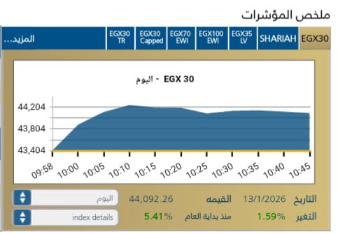 استهلت البورصة المصرية تعاملات جلسة اليوم الثلاثاء 13 يناير على اتجاه صاعد جماعي لمؤشراتها الرئيسية، بدعم من عمليات شراء مكثفة من المؤسسات المحلية والأجنبية، مع استمرار الأداء الإيجابي لأسهم البنوك والصناعات الثقيلة.
