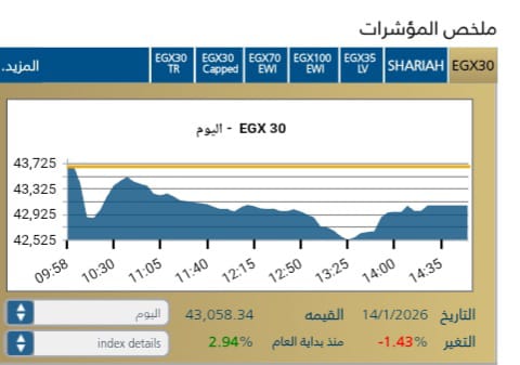 شهد المؤشر الرئيسي EGX30 تراجعًا بنسبة 1,43- % ليغلق عند مستوى 43,058,34 نقطة، وسط تدولات قيمتها 4,729 مليار جنيه .