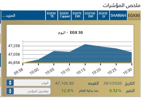 حيث شهد المؤشر أعلى قيمه له عند 47,294,83 نقطه وأدنى قيمه له عند 46,857,73 نقطه خلال الدقائق الأولى من التعامل .
