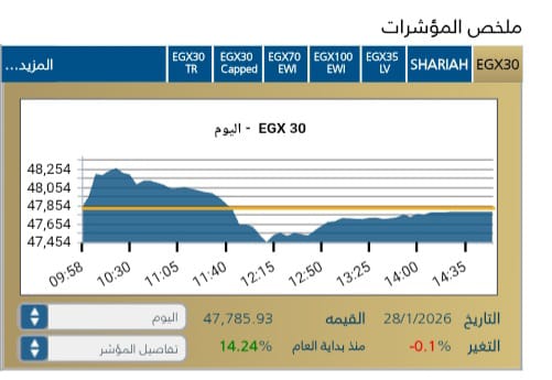 شهد المؤشر الرئيسي EGX30 تراجعًا بنسبة 0,1-ليغلق عند مستوى47,785,93 نقطة، وسط تدولات قيمتها 7,544مليار جنيه .