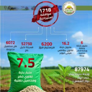 واصدرت اللجنة خلال العام ذاته 1718 موافقة استيرادية لتلبية الإحتياجات، شملت الموافقة على استيراد نحو كمية 6072 طن محاصيل متنوعة، و 16.2 مليون و 277 ألف و 625 درنه تقاوى بطاطس مينى تيوبر ذات الإنتاجية العالية، و7.5 مليار بذرة تقاوى خضر ومحاصيل حقلية، إضافة إلى نحو 6 مليون شتلة وعقلة وبصلة، عين (خضر – فاكهة – زينة)، و 6200 مرستيم موز ، و 52750 فسيلة نخيل بلح من الأصناف المتميزة، 87974 وحدة ( بنجر سكر – بنجر علف – دوار الشمس).