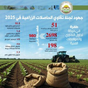 ووفقا للتقرير، عقدت اللجنة خلال 2025، نحو 51 اجتماعا، أصدرت خلالها نحو 2698 موافقة، تنوعت بين الصادرات والواردات، حيث فتحت آفاقا تصديرية لحوالي 32.3 ألف طن تقاوي محاصيل حقلية ومحاصيل اخرى تشمل الخضر، والنباتات الطبية والعطرية والفاكهة، إضافة إلى 1.2 مليون درنه تقاوى بطاطس مينى تيوبر، و 7.7 مليون بذرة تقاوى خضر، 29.6 مليون شتلة وعقل فاكهة، ونباتات زينة، إضافة إلى 410 مرستيم نخيل بلح، وذلك من خلال 980 موافقة تصديرية تم إصدارها خلال العام، مما يؤكد الثقة الدولية في جودة التقاوي والشتلات المنتجة على أرض مصر.
