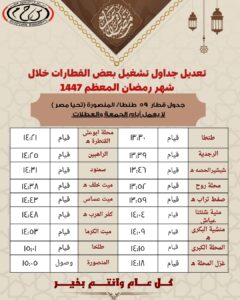 تقرر تعديل مواعيد بعض القطارات على عدد من خطوط الشبكة لسكك حديد مصر، بما يتماشى مع طبيعة التشغيل وخدمة جمهور الركاب خلال الشهر الكريم، وذلك اعتبارًا من يوم الاربعاء الموافق 18 فبراير 2026، ومع بدء شهر رمضان المعظم كالتالى :