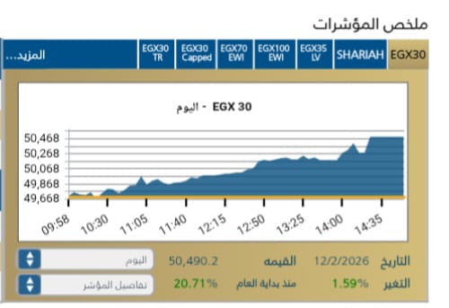 وجاء أداء السوق إيجابيًا مع اتجاه المؤشر الرئيسي EGX30 للارتفاع بنسبة 1,59% ليغلق عند مستوى 50,490,2 نقطه بنهاية الجلسة، وسط تدولات قيمتها 6,8 مليار جنيه .