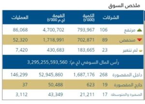 بلغ عدد العمليات المنفذه 145,808 المقيده نحو 3,295,255,593,560 تريليون جنيه بدعم من المؤسسات المحليه ،مع ترقب المستثمرين استمرار هذا الزخم خلال الجلسات القادمه.