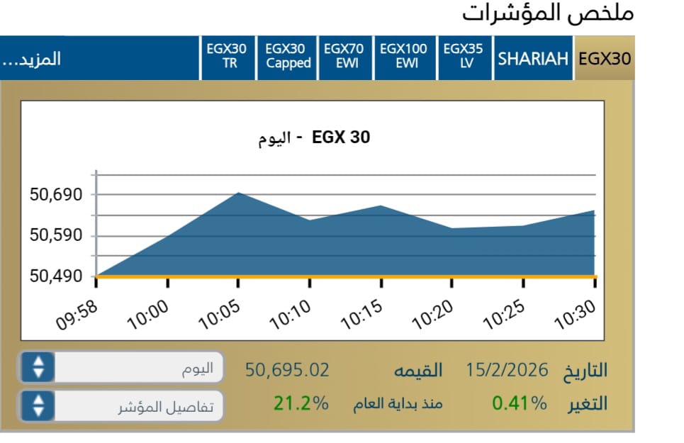 حيث سجل المؤشر الرئيسى للبورصه EGX30 صعودا ملحوظا بنسبة 0,41 % مع بداية الجلسه يمثل 50,490,2 نقطه .