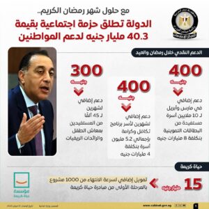 وتشمل الحزمة إجراءات للدعم النقدي، وتعزيز الخدمات الصحية، ودعم مشروعات التنمية، ومساندة الفلاح المصري بما يسهم في تحسين مستوى معيشة المواطنين، بقيمة 40.3 مليار جنيه لدعم المواطنين.