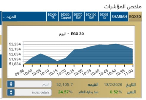 حيث شهد المؤشر أعلى قيمه له عند 52,244,51نقطه وأدنى قيمه له عند 51,833,76 نقطه خلال الدقائق الأولى من التعامل .