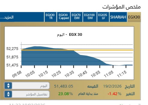 استهلت البورصه المصريه جلسة الثلاثاء على تراجع واضح بنسبة 1,42-%، حيث سجل المؤشر الرئيسىEGX30 هبوطا ملحوظا مع بداية الجلسه يمثل 52,222,34 نقطه .