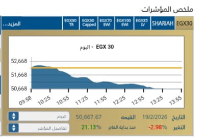 شهد المؤشر الرئيسي EGX30 تراجعًا بنسبة 2,98-% ليغلق عند مستوى50,667,67 نقطة، وسط تدولات قيمتها 5,6 مليار جنيه .