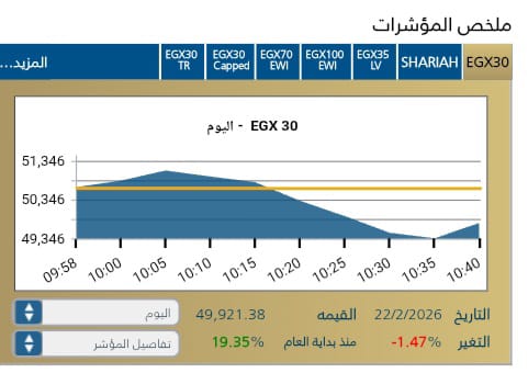 حيث شهد المؤشر أعلى قيمه له عند 51,097,97نقطه وأدنى قيمه له عند 49,346,41نقطه خلال الدقائق الأولى من التعامل .