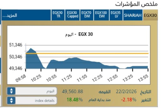 شهد المؤشر الرئيسي EGX30 تراجعًا بنسبة 2,18-% ليغلق عند مستوى 49,560,88 نقطة، وسط تدولات قيمتها 4,5 مليار جنيه .