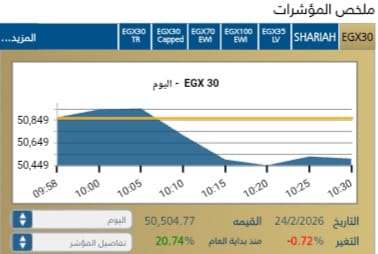 استهلت البورصه المصريه جلسة الثلاثاء على تراجع واضح ، مؤشر EGX30 يتراجع ب 0,72-% مع بداية الجلسة اليوم ، سجل المؤشر الرئيسى EGX30 هبوط ملحوظ مع بداية الجلسه يمثل 50,870,06نقطه .