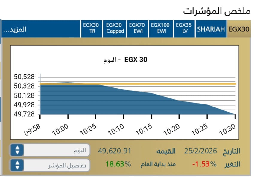 استهلت البورصه المصريه جلسة الثلاثاء على تراجع واضح ، حيث سجل المؤشر الرئيسى EGX30 هبوطا ملحوظا بنسبة 1,53-% مع بداية الجلسه يمثل 50,390,21نقطه .