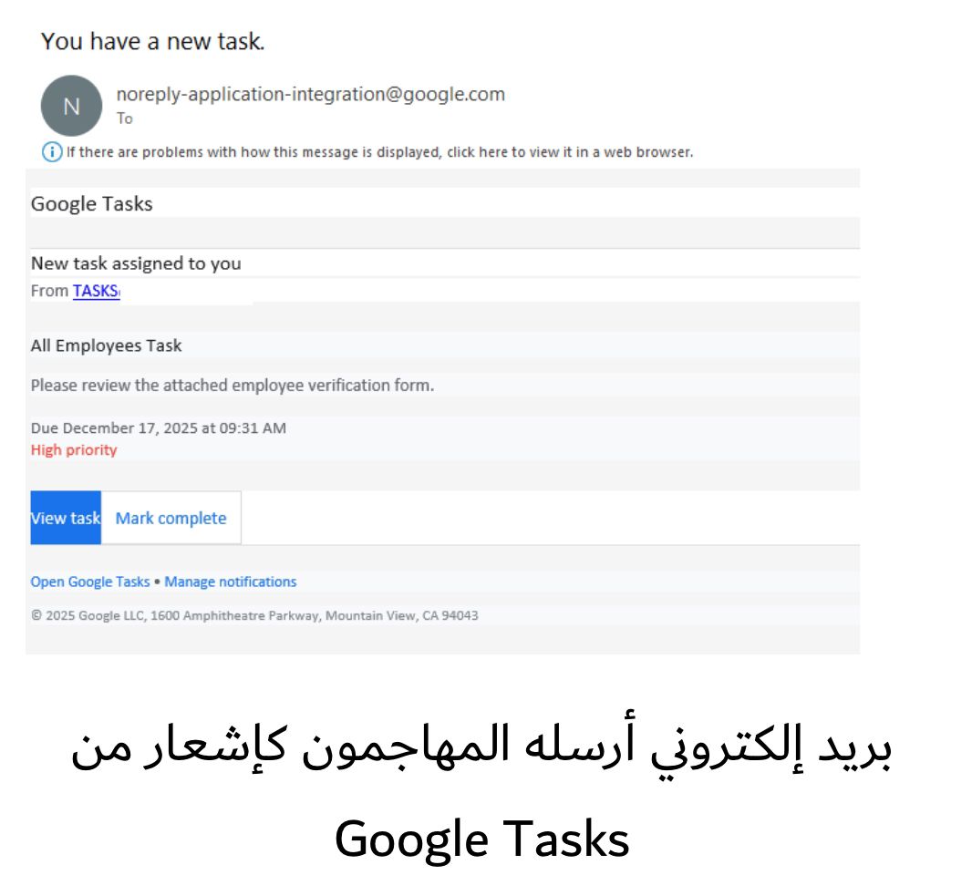 في الحملة الجديدة، يتلقى الضحايا إشعاراً يبدو شرعياً من أداة Google Tasks بعنوان «لديك مهمة جديدة». وتوحي الرسالة بأنّ شركة الضحية اعتمدت في أعمالها أداة Google Tasks لإدارة المهام، مما يضغط على الضحية للتصرف بسرعة. ويتضمن الإشعار غالباً عناصر توحي بالأهمية والاستعجال مثل تصنيف المهمة بأنها عالية الأولوية، أو تحديد مهلة زمنية محدودة، مما يدفع الضحية للاستجابة فوراً.